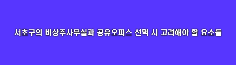 서초구에서 비상주사무실이나 공유오피스를 선택하기 전에 몇 가지 고려해야 할 요소가 있어. 먼저는 위치야. 교통이 편리한 곳이 좋고, 비즈니스 관련 시설도 근처에 있으면 더 유리해. 다음은 비용이야. 회사의 예산에 맞는 옵션을 찾는 게 중요해. 시설과 서비스의 질도 무시할 수 없는 포인트야. 이를 통해 편리함과 효율성을 얻을 수 있어.